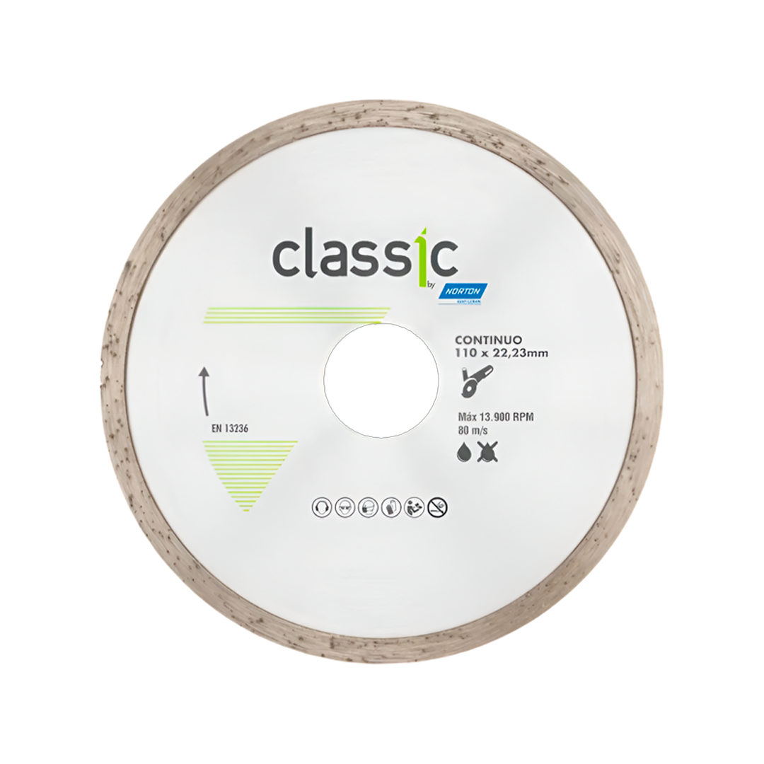 | Características Técnicas | Tipo de borde: Continuo (proporciona el acabado más suave y prolijo). Tipo de corte: Únicamente corte húmedo (requiere refrigeración por agua para evitar el sobrecalentamiento del diamante). Material de aplicación: Porcelanato, cerámica, mármol y placas de (fibrocemento) de alta densidad. Calidad: Línea Classic de Norton, reconocida por su excelente relación costo-rendimiento para el instalador profesional. Compatibilidad: Apto para amoladoras angulares de 4.5 pulgadas. |