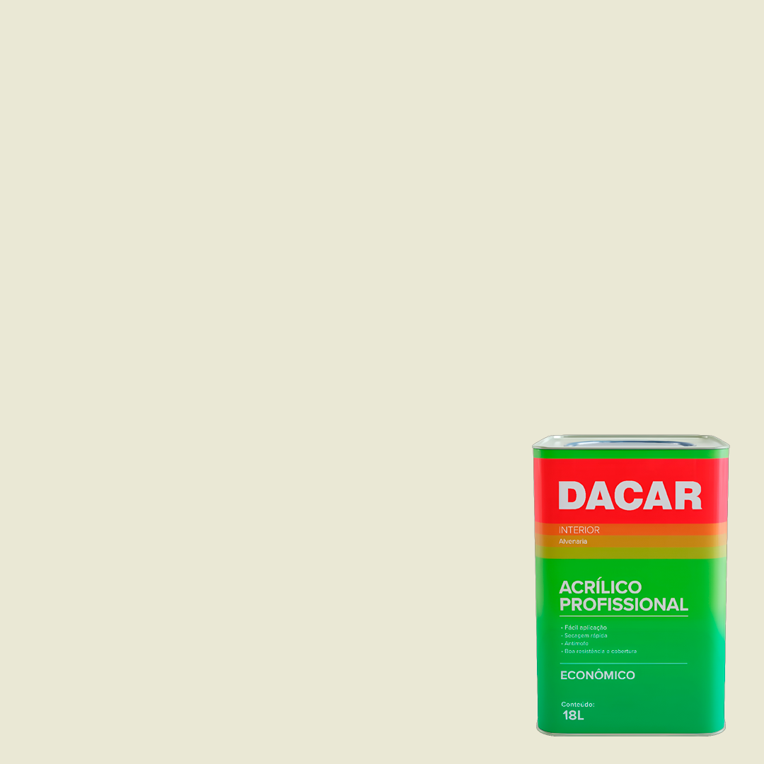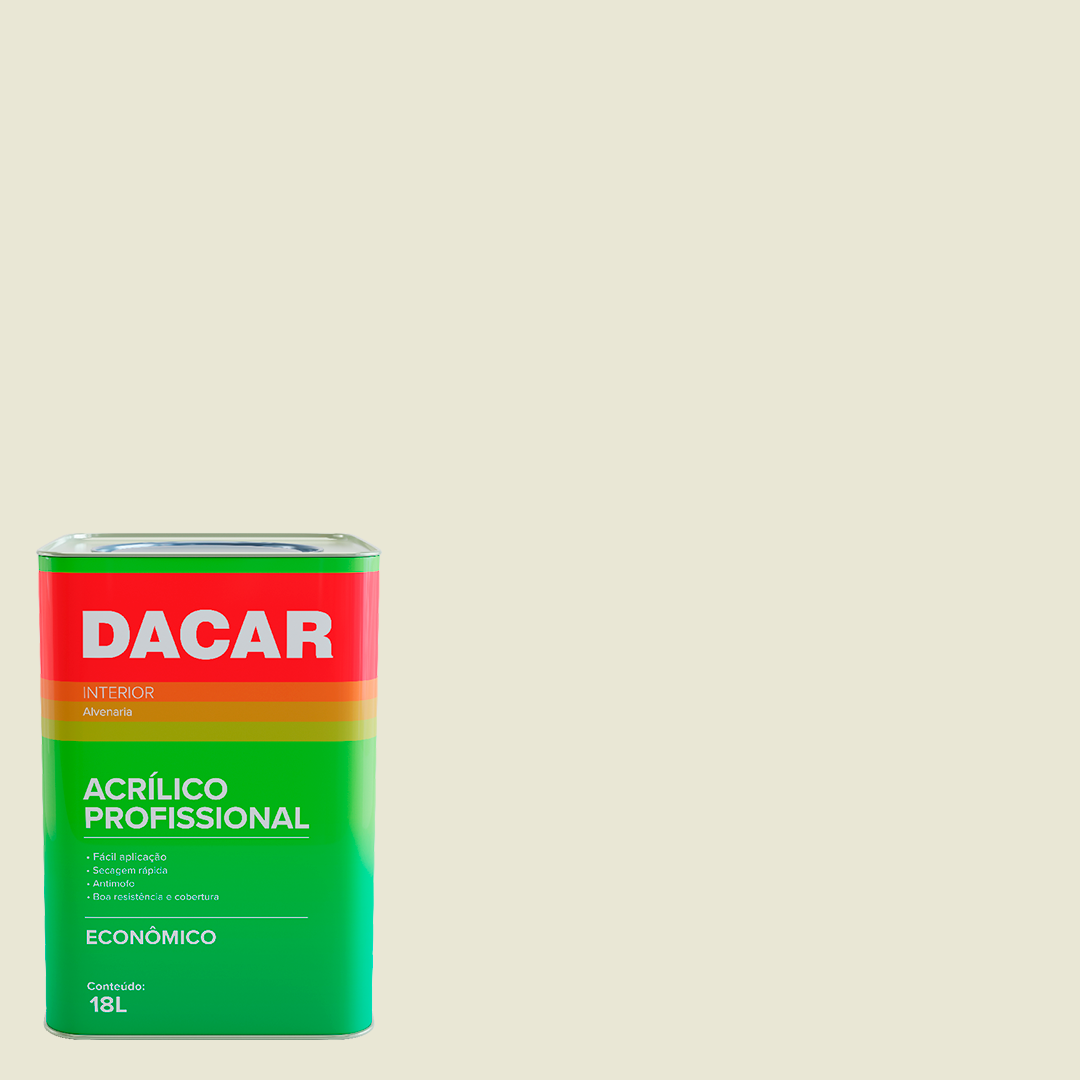 | Características Técnicas | Marca: Dacar (Línea Profesional). Contenido: 18 Litros. Color: Gelo / Hielo. Acabado: Mate. Ambiente: Interior. Rendimiento: Hasta 280 m² por mano (puede variar según la porosidad del fibrocemento). Secado: * Al tacto: 1 hora. Entre manos: 4 horas. Final: 12 horas. Aplicación: Rodillo de lana, rodillo antigoteo, pincel o pistola. |