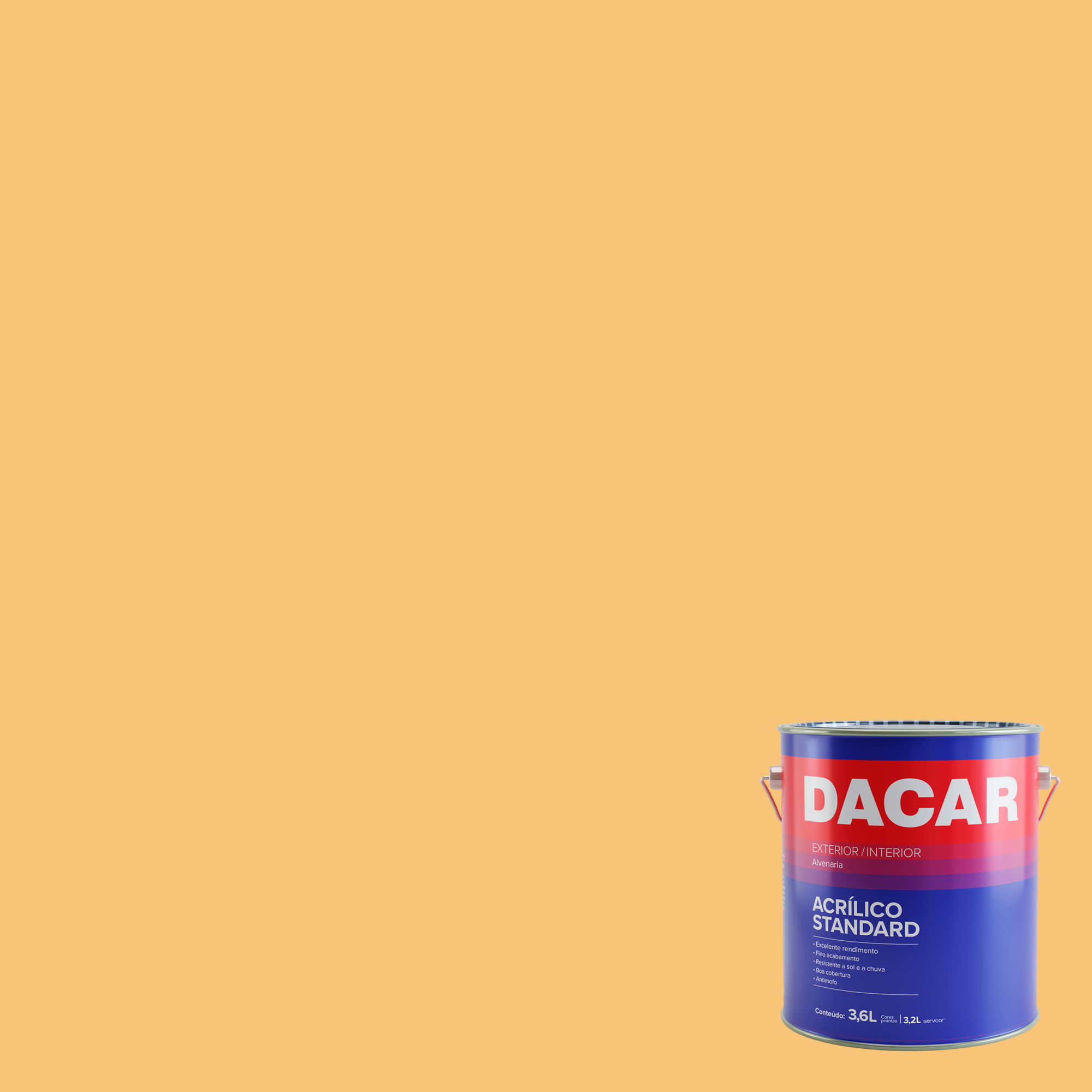 | Características Técnicas | Marca: Dacar. Línea: Standard Tipo: Pintura acrílica para interiores y exteriores. Buena cobertura y adherencia. Acabado uniforme y mate. Secado rápido. Contenido: 3,6 L Rendimiento: 25 a 35 m² por mano (aprox., según superficie). Secado al tacto: 2 a 4 horas. Repintado: 6 horas (aprox.). |