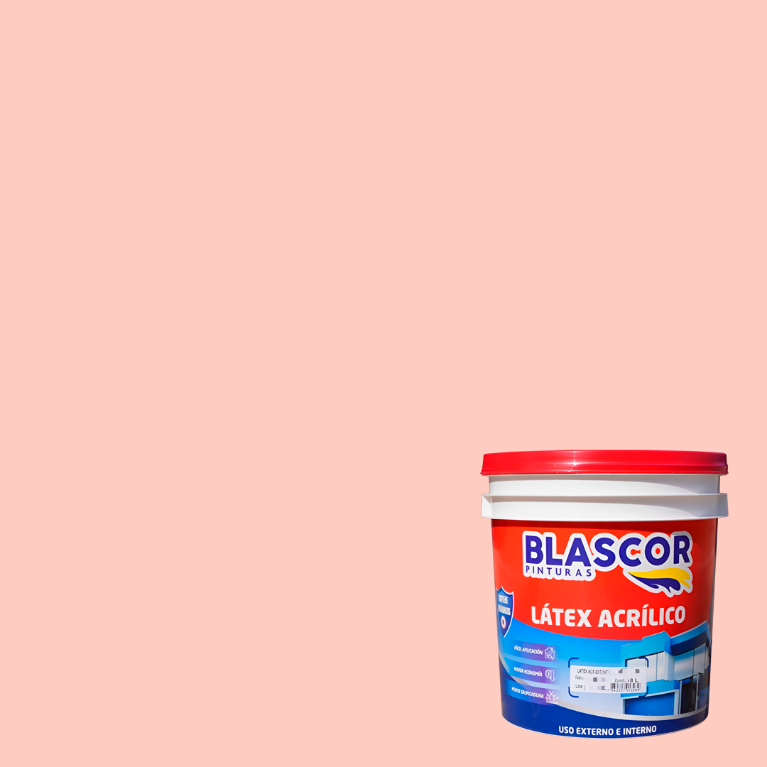 | Características Técnicas | Marca: Blascor Tipo: Látex Acrílico Premium. Color: Rosa. Uso: Interior y Exterior. Rendimiento: Aproximadamente de 150 m² a 200 m² por mano (dependiendo de la porosidad de la superficie y la dilución). Secado: Al tacto: 1 hora. Entre manos: 4 horas. Secado final: 12 horas. |