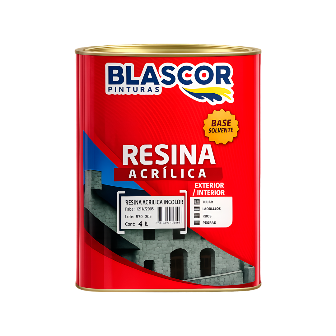 | Características Técnicas | Marca: Blascor. Tipo: Resina acrílica impermeabilizante. Base: Solvente (ofrece mayor dureza y brillo). Rendimiento: Entre 30m2 y 45m2 por mano por envase de 4L (dependiendo de la absorción). Acabado: Generalmente incoloro brillante (disponible también en tonos cerámicos o grises). Secado: Al tacto en 30-60 minutos; entre manos 6 horas; secado final 24 horas. Propiedades: Alta resistencia a los rayos UV, excelente adherencia y repelencia al agua. |