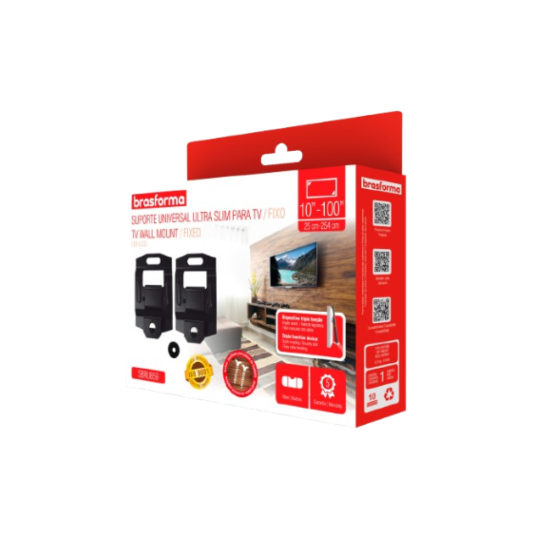 | Características Técnicas | Marca: Brasforma Modelo / Código: SBRU859 Tipo: Universal de pared Compatible con TV de: 26" a 55" aprox. Carga máxima: 35 kg Material: Acero de alta resistencia con acabado negro mate Sistema de montaje: Incluye tornillería |