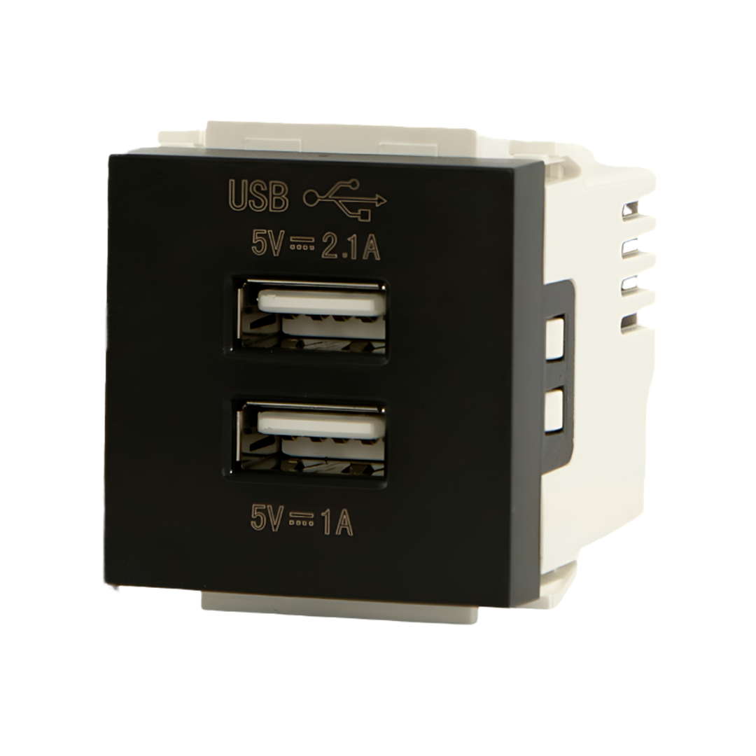 | Características Técnicas | Modelo: C19913-1. Tipo de Puerto: Doble USB Tipo A. Ancho del Módulo: 36 mm (Módulo ancho/doble). Entrada (Input): 110V – 250V AC (Bivolt). Salida (Output): 5V DC. Amperaje: Generalmente 2.1A repartidos o totales (permite carga rápida en un puerto o carga estándar simultánea). Color: Negro Mate. Material: Policarbonato ignífugo de alta resistencia. Compatibilidad: Compatible con bastidores y placas de la línea modular de Elektron (C19). |